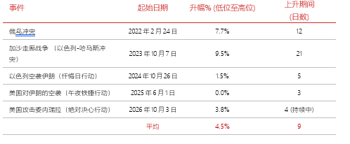 对石油以外行业的影响。黄金是最终的地缘政治对冲工具。委内瑞拉事件仅是美国对潜在威胁采取军事行动的最新发展;在委内瑞拉之前,美国2025年6月在“午夜铁锤行动” 中空袭伊朗。除了拉丁美洲和中东,俄乌冲突持续令欧洲深陷战火。在这种地缘政治不确定性加剧和美国军事行动倾向上升的背景下,黄金成为主要的受惠者;因为越来越多一般和机构投资者都将资金配置于黄金,作为投资组合的风险分散工具。根据以往的军事冲突经验,黄金价格会因避险需求激增而出现短期上升的行情;平均而言,升势持续约9天,幅度从低位到高位约4.5%。除了短期上升之外,黄金还持续受惠于以下结构性趋势,这将使其在中长期内保持强劲需求:1)美国财政担忧和货币贬值风险上升;2)宏观经济不确定性升温;以及 3)各国央行持续购买黄金和储备多元化。简而言之,委内瑞拉冲突再次印证了星展集团长期以来看好黄金及其作为投资组合风险分散目标观点。