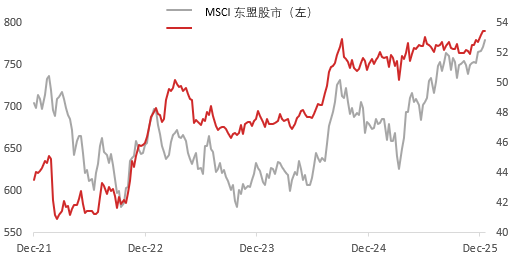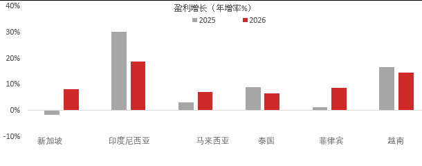 东盟股市可望持续强劲扩张,延续2025年12%的上升动力。企业盈利增长动能可望从2025年的年增1%显著加速至2026年的9%。宽松的货币政策和提振消费的财政措施将提振国内需求,而全球贸易不确定性缓和也可望为出口导向行业带来一些利好。同时,相较于全球其他股市,东盟股市的估值优势使其有望成为全球资本轮动的受惠者。